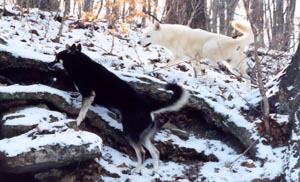 These are my male Hybrid Wolves: Banchi the white one is constantly causing problems. Littleman the dark one is very calm and peaceful. Someday we hope the two of them will figure out which one is dominant and the backyard will become a place of peace and tranquility. Until that time comes we have gotten used to the idea of voices being raised in anger at all hours of night or day. | |||||||||||||||||||||||